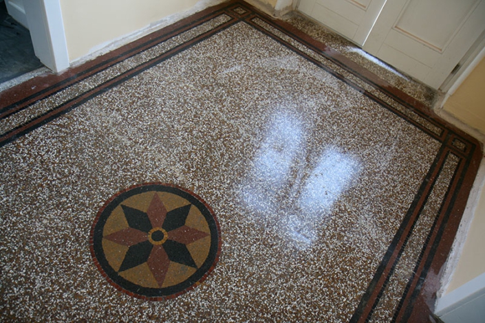 Terrazzoböden, eine bereits aus der Antike bekannte und dekorative Art Bodenflächen zu gestalten. Hierbei werden oft farbige Zuschlagstoffe auf einen meist zementgebundenen Estrich als Unterlage erdfeucht eingebracht, gestampft, gewalzt und nach Austrocknung geschliffen und poliert.